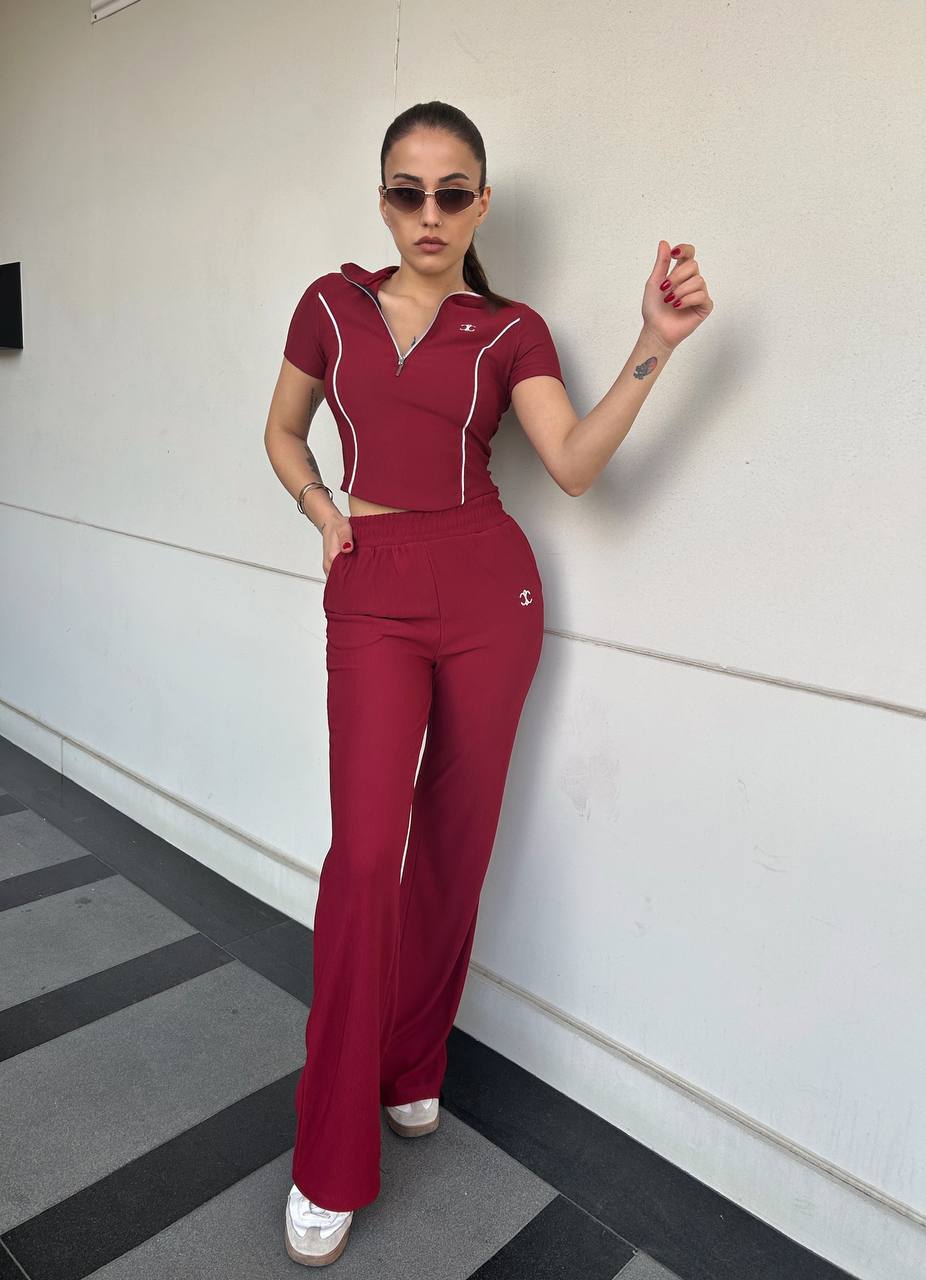 Athleisure gets a sleek upgrade with the Ayla Sporty Set. This two-piece wine red look features a zip-up crop top with contrast white piping and high-waisted flared pants for a streamlined silhouette. Made for movement and style, it’s the perfect fusion of streetwear and activewear.