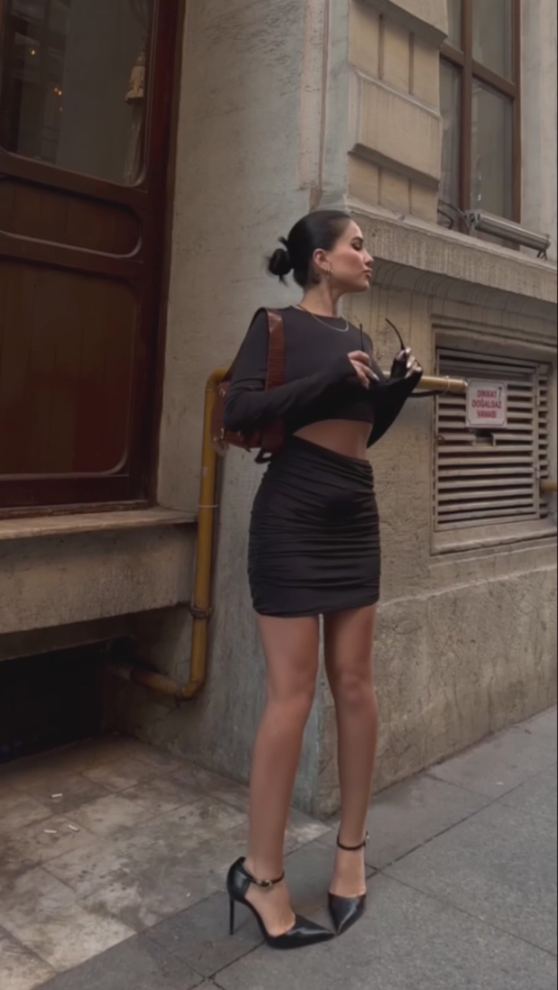 Bold, sleek, and unapologetically confident — the Kira Cut-Out Dress is your new night-out essential. This curve-hugging mini features a long sleeve silhouette, a high neckline, and a daring front cut-out that highlights the waist for an edgy twist. Paired with boots and a blazer, it’s the perfect mix of elegance and street chic.